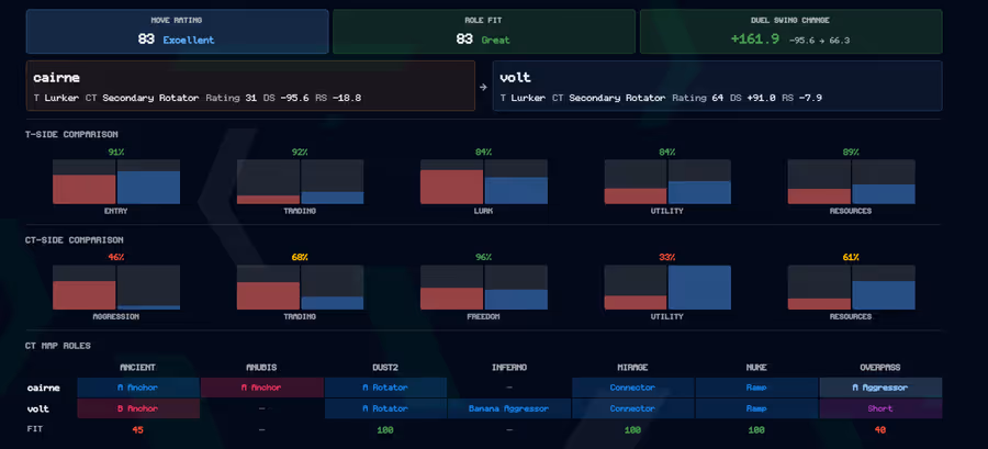 On the T side it’s a pretty like-for-like fit in terms of style, and they share four roles on the CT side, albeit JBa plays a little more aggressively in our sample size. He’d need to throw a lot more utility and probably take more straight up duels than trades, but it’s clear he can win duels, as that duel swing is amazing.