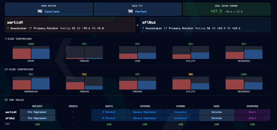 In terms of how they’ve played this year, both in the data and to the eye test, it’s just a strict upgrade. The issue with the move would simply be that xertioN has proved his ceiling can be extremely high, and we’re not sure yet that xfl0ud’s is there, especially as MOUZ are reportedly looking at an IGL change and they might get xertioN back to his best.