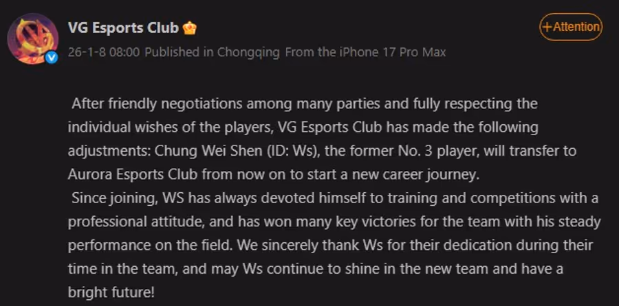 Early on January 8th, 2026, a post was made by Vici Gaming via the organisation’s Weibo account. In their communication, VG confirmed that Chung “Ws” Wei Shen would be departing from the team and joining forces with Aurora Gaming. This was later confirmed by Aurora themselves when they made an announcement via their own social media channels.