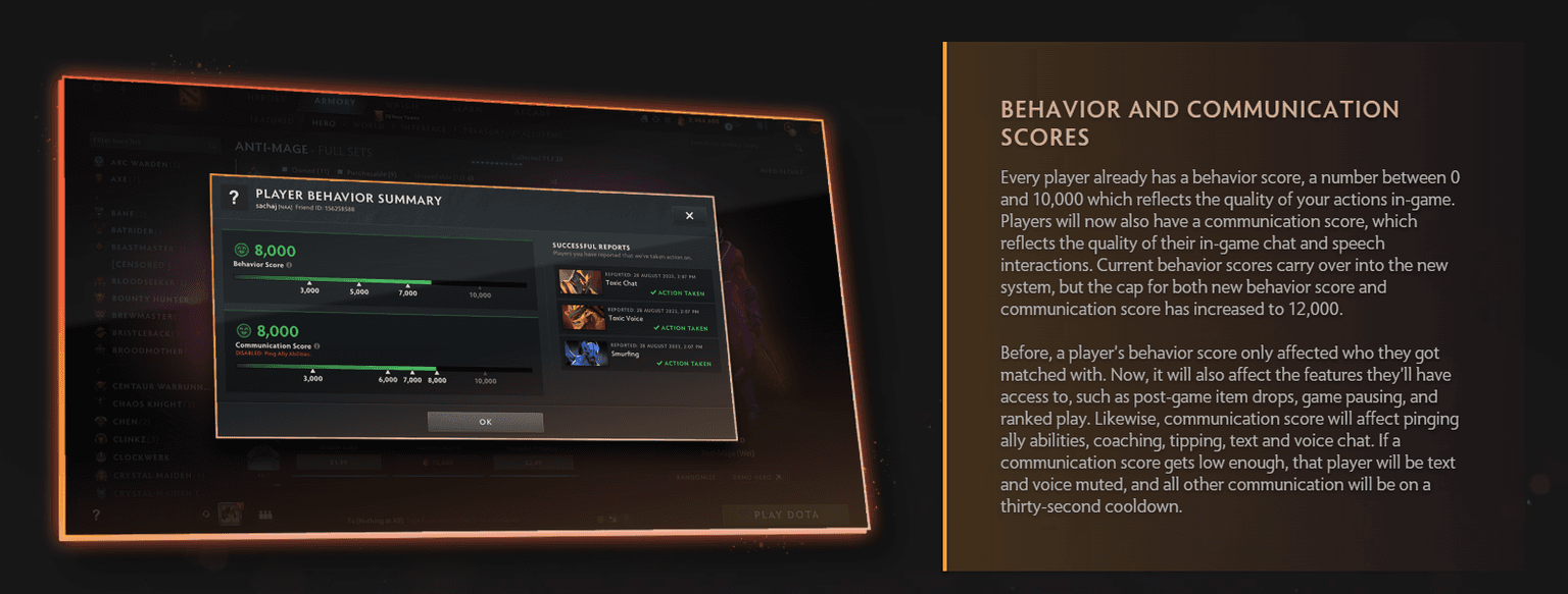 This is where the report system links into your MMR and ranked gameplay. Player behaviour and communication score is, much like MMR, something that all players in Dota 2 have. The number determines a few things within the game. Certain score breakpoints unlock different features, including simply messaging, pausing, tipping, voice chat, and even coaching.
