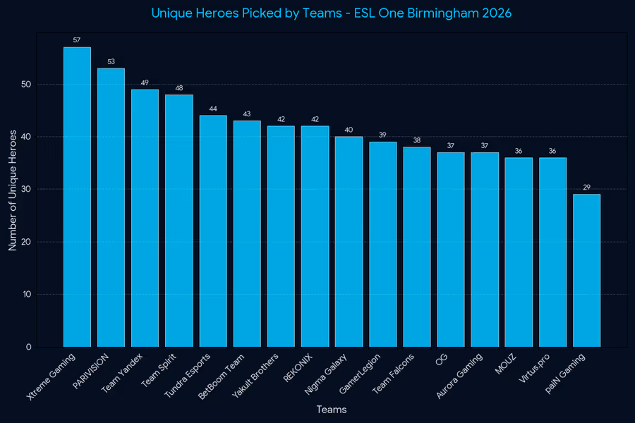 Xtreme Gaming, who placed third in Birmingham, delivered the most diverse drafts and turned out to be the most flexible team of the tournament with 57 unique heroes picked across their 26 games. PARIVISION followed closely with 53 unique heroes in 23 games.