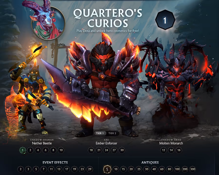 Much like the previous Quartero’s Curio event, nearly every early level will net you something special in the cosmetic department. This comes in the form of either a piece of a hero’s cosmetic set, or special effects for in-game items. With Antiques rewarded at levels 5, 10, 15, 20, 25, 30, 40, 60, 80, 100, 200, and 300, players can grab themselves tons of extra sets and possible Arcanas for their grind.