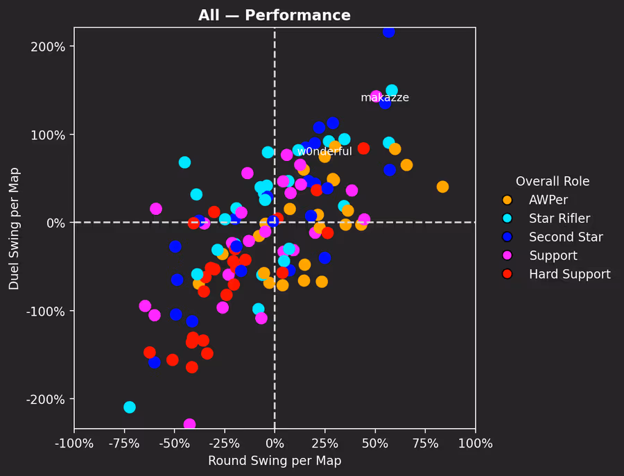 El ridículamente alto swing de duelos de makazze (150% es de élite, jugador top 5 en el nivel mundial durante un largo periodo de tiempo) le hace destacar inmediatamente en el gráfico, y que su swing de rondas se alinee de algún modo muestra que tampoco lo hacía sólo por aparentar. Ganaba duelos difíciles, ganaba muchos duelos y tenía un gran impacto en las rondas.