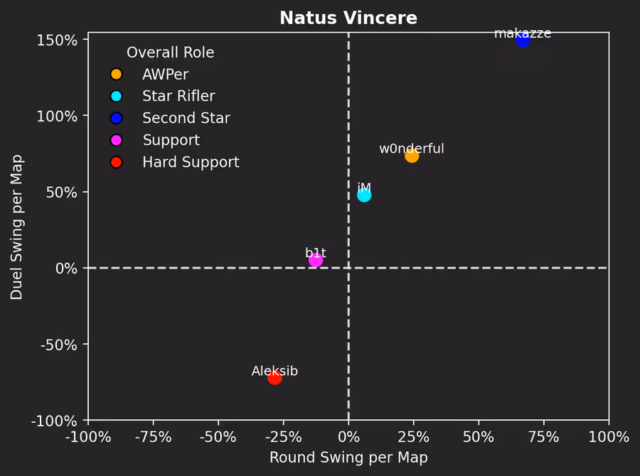 Esto también disparó su rendimiento general a lo largo del evento, en el que registró el tercer swing de duelo más alto de los AWPers. Esto sugiere que no se está jugando con él hasta el punto de conseguir duelos superfáciles en situaciones clave, porque su balance de rondas no es tan alto.