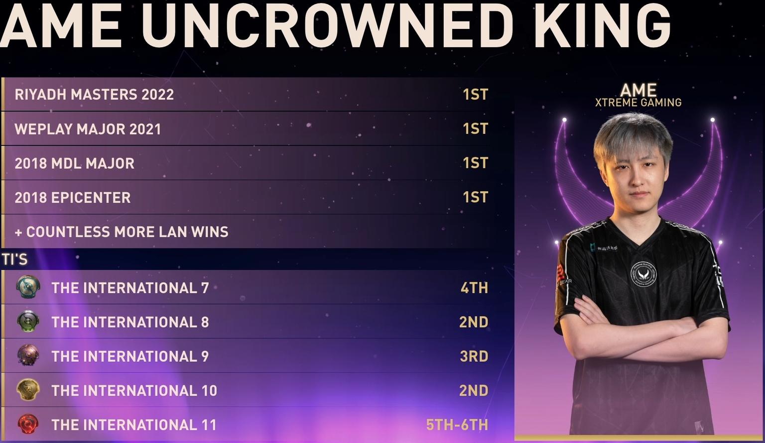 Wang "Ame" Chunyu, conhecido no mundo do Dota 2 como "o rei sem coroa", já teve a sua quota-parte de decepções no TI. Com a sua sétima participação no prestigiado evento, Ame entrou em mais uma grande final, na esperança de finalmente reclamar a sua coroa. Do outro lado está Andreas "Cr1t-" Nielsen, presente na sua nona TI consecutiva - também sem um título em seu nome. Um destes dois jogadores iria finalmente obter o seu Aegis of Champions.