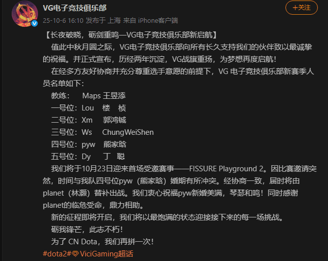 Numa publicação feita através da conta Weibo da organização, a VG anunciou o seu regresso. Após um hiato de dois anos, uma nova equipa é formada sob a bandeira, já com grandes esperanças em 2025. Embora a equipa seja muito diferente da sua tentativa de qualificação para o TI 2025, mantém o jogador de apoio da posição 5, Ding "Dy" Cong, a bordo.